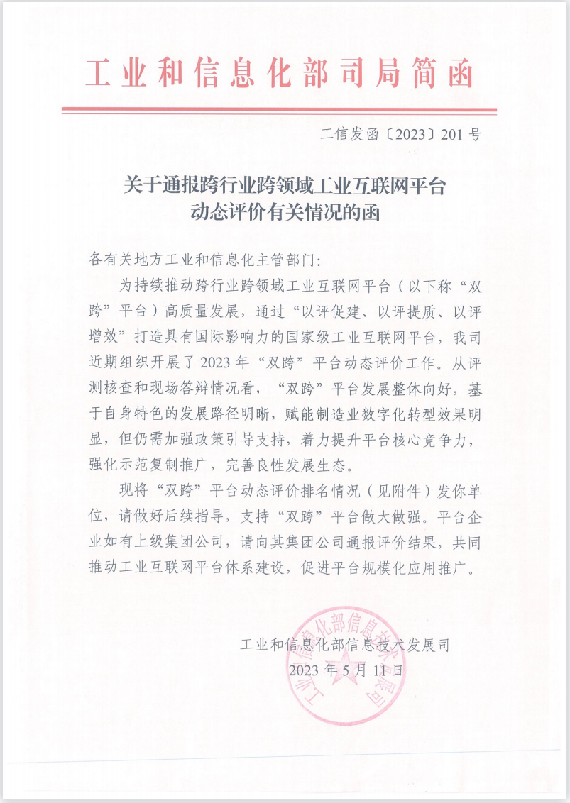 Recently, to implement the State Council's Guiding Opinions on deepening 'Internet + Advanced Manufacturing' to develop industrial internet, according to the Industrial Internet Innovation and Development Action Plan (2021-2023) requirement to establish a dynamic evaluation mechanism, to promote the high-quality development of cross-industry cross-domain industrial internet platforms (abbreviated as 'Cross-Industry Cross-Domain' platforms), the 2022 dynamic evaluation of 28 enterprises that have been rated as Cross-Industry Cross-Domain platforms, guided by MIIT, has been successfully completed.