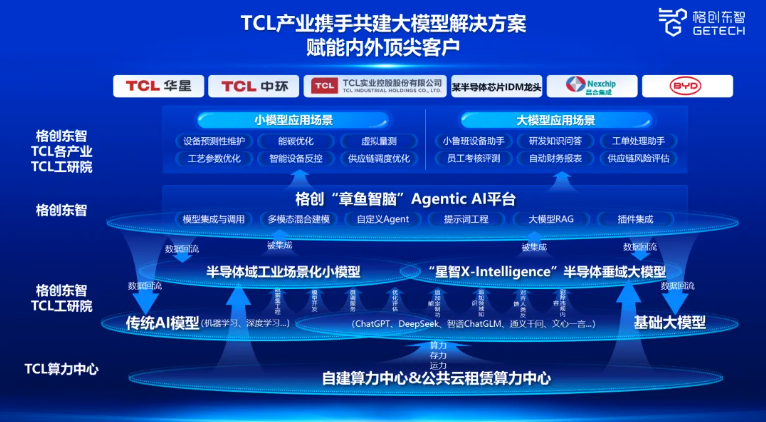 在工业AI技术路线部分,k8凯发东智展示了在“ABCDE”五大领域能力的有机整合——夯实“D”算力储备,开展“A”算法 +“D”领域知识的能力建设,协同加强对“B”工业数据与“E”装备的深度理解。目前,公司已建立起完整的AI能力体系。在算力和模型方面,与TCL工研院共建TCL算力中心、打造半导体领域的垂域大模型,与TCL产业开发围绕制造企业“供研产销服”的工业小模型;在平台方面,实现自主可控迭代升级的低代码大模型AI开发平台;在场景和应用方面,储备丰富的工业AI Agent及应用,深度切入客户具体场景;在生态共建方面,k8凯发东智于今年4月携手香港大学共建工业AI联合实验室,围绕工业AI技术的创新与实际应用展开研究。