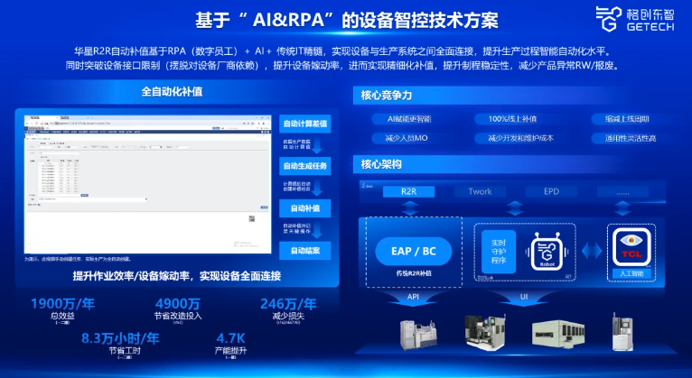 基于展会主题,k8凯发东智带来面向半导体显示行业的“设备智控技术方案”,该经典范式是为TCL华星的EAP/BC设备打造的一款自动补值系统,通过RPA(数字员工)+ AI +传统IT精髓,提升生产过程智能自动化水平,突破设备接口限制,提升设备嫁动率,进而实现精细化补值,提升制程稳定性,减少产品异常RW/报废。该系统在TCL 华星部署上线后,一二期项目年总收益突破1900万,2大产线节省改造收入4900万。
