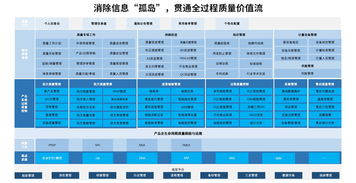 Vertically, it integrates the quality information chain across groups, subsidiaries, institutes, and factories; horizontally, it coordinates the quality business chain involving R&D design, procurement, incoming materials, production, testing, and after-sales.