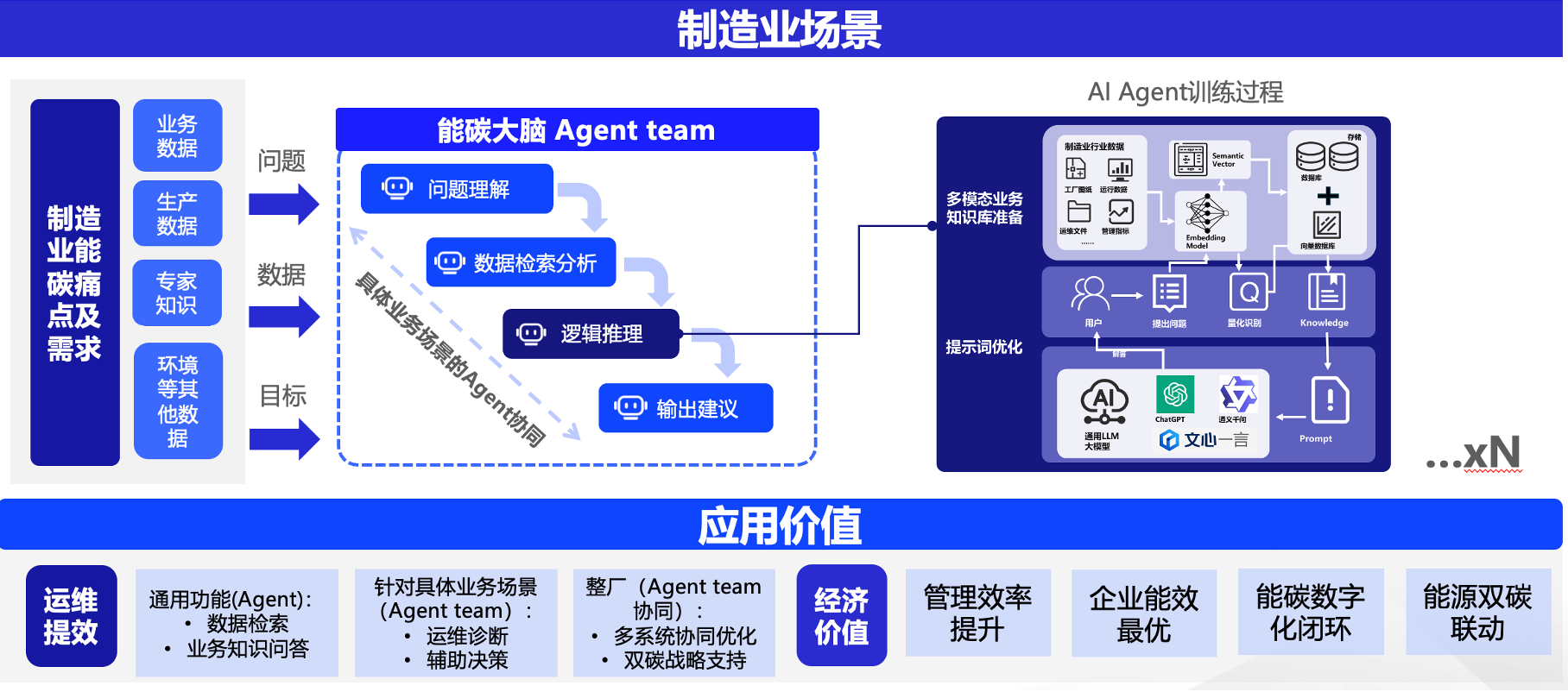 The system framework comprises 1 platform + 3 applications + N optimization scenarios, utilizing a multi-agent large model foundation to create vertical algorithm models that empower N optimization scenarios, delivering the optimal solution for corporate energy-saving and carbon reduction. It digitally integrates end-to-end management of corporate energy and carbon emissions. Based on overall sustainability goals and current energy-carbon management status, it addresses diverse business needs through the Multi-Agent multi-agent technical approach, integrating general large language models (LLM) to build vertical large model applications for corporate energy and dual-carbon. This enables closed-loop management across scenarios such as energy monitoring, analysis, maintenance, carbon emission modeling, accounting, and trading. AI intelligent algorithms and mechanistic models are applied in key scenarios, e.g., "intelligent analysis + energy-saving transformation" for critical public auxiliary power equipment, optimizing corporate energy efficiency and reducing carbon at the source.