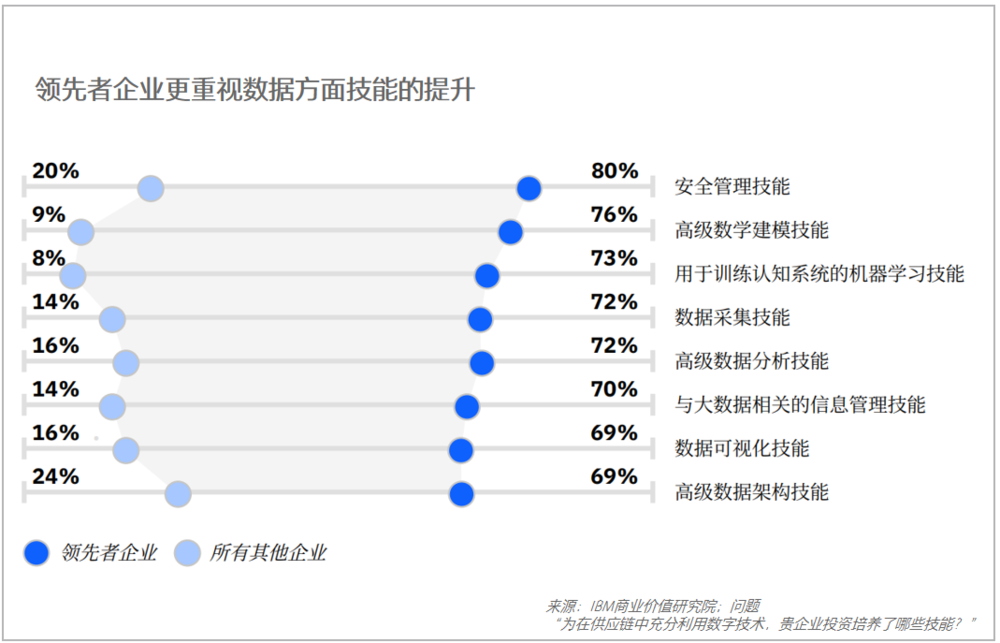 Overall, what are the new trends and practical highlights? 1. People, machines, and enterprises are collectively experiencing a data revolution. Data analysis significantly impacts enterprise operations and decision-making and is reshaping competitiveness. As shown in the table below, leading enterprises place great importance on enhancing data-related skills, such as valuing talent with technical and data thinking, developing machine learning, and deploying artificial intelligence systems.
