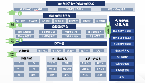 Energy consumption data from these endpoints is collected via edge computing and universal gateways on the GTRONTEC IoT platform. Data analysis, governance, algorithm analysis, and equipment diagnosis are then performed on the GTRONTEC data platform. Results are displayed on the terminal energy management platform for real-time monitoring, offering optimized management solutions for various energy-consuming equipment.