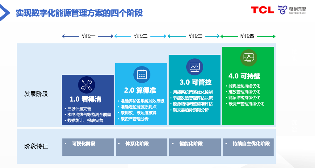 Against the backdrop of dual carbon goals, Wang Hui of GTRONTEC believes that implementing dual carbon strategies is of crucial strategic significance for manufacturing enterprises. He pointed out that comprehensive emission reduction and carbon reduction actions can truly achieve cost reduction and efficiency improvement, creating sustained optimization and profitability for enterprises. From an ESG perspective, it also aids in brand building and attracting investors.Addressing how manufacturing enterprises can achieve carbon peaking and carbon neutrality, Wang Hui outlined four stages and key points for implementation at the factory level: