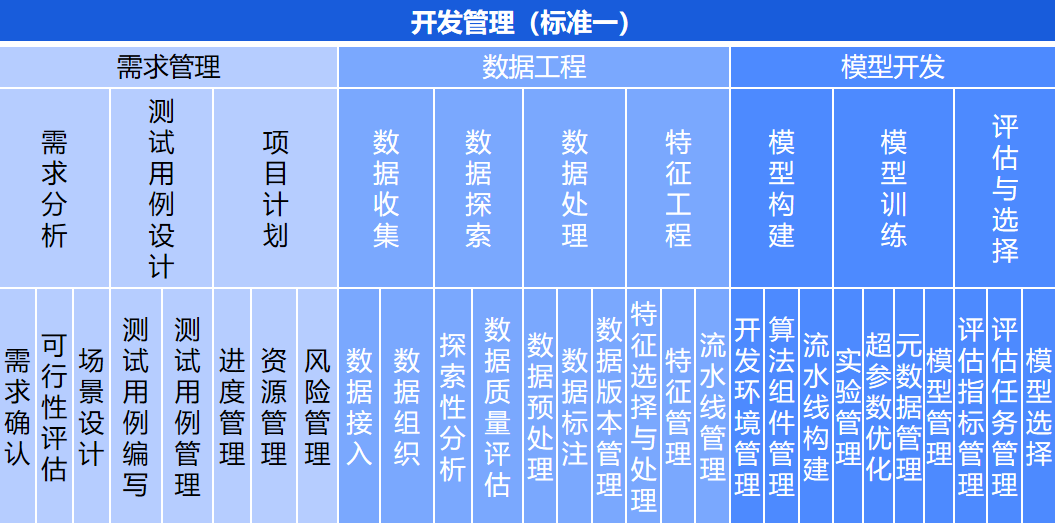 As the first standard in the "Artificial Intelligence Development and Operations Integration (Model/MLOps) Capability Maturity Model" series, this standard fills the gap in development management standards for machine learning projects both domestically and internationally. The standard addresses three capability sub-domains: requirement management, data engineering, and model development, including 10 capability items and 28 sub-items. It proposes five levels of capability requirements for the machine learning development management process: Basic, Professional, Excellent, Outstanding, and Leading.