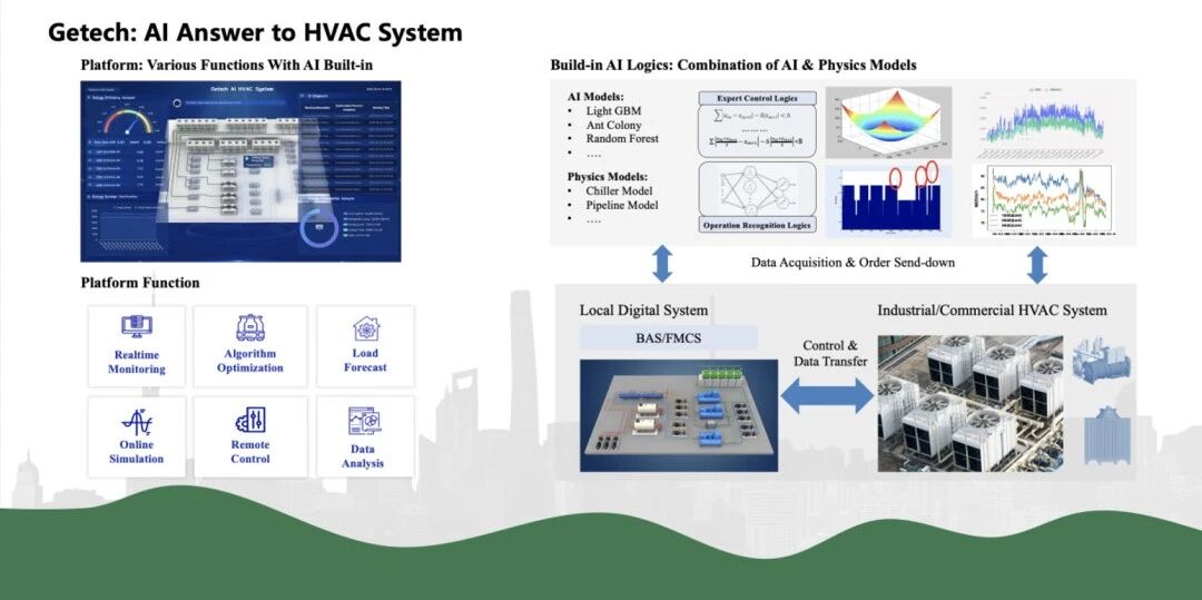 有机结合Light GBM、Random Forest等AI智能算法,及基于设备/系统物理特性构筑的机理模型,实现实时调控冷水机组、风机、水泵等设备,确保整体系统始终以最优能效运行,最大能源利用效率,减少碳排放,最终助力楼宇设施绿色化、低碳化。