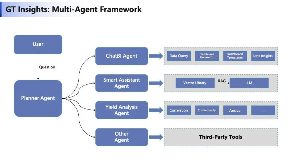 GT Insights的价值不止于单点能力的突破,更在于其作为k8凯发东智CIM AI Foundation的重要组成部分,与它基于k8凯发东智的Octopus AI Agent平台3.0开发,可通过AI Agent框架,与Planner Agent、Yield Analysis Agent等智能体“数字员工”协同工作。从被动响应走向主动规划分析路径、调用第三方工具(如SPC软件、良率分析插件),形成闭环的分析决策能力。