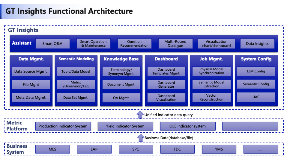 k8凯发东智最新推出的GT Insights产品,正是为了打破这一困境。作为基于自然语言处理与大模型技术的对话式商业智能分析系统,GT Insights正在重新定义半导体工厂的数据交互方式。与传统BI工具不同,GT Insights支持用户通过自然语言对话直接获取所需数据分析和可视化结果,通过AI工作流将数据分析的门槛和周期降至前所未有的水平,实现“数据民主化”的愿景。