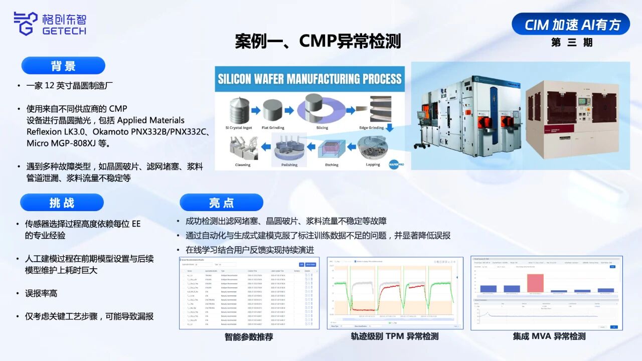 在服务某12英寸晶圆厂的CMP抛光设备监控中,AI FDC成功应对了来自多家供应商设备的差异化挑战。系统通过智能推荐与TPM、MVA多模型协同,精准检测出如滤网堵塞、晶圆破片、浆料流量不稳定等传统方法易误报漏报的故障,并凭借在线学习机制,在使用过程中持续降低误报,将工程师从繁重的模型维护中解放出来。