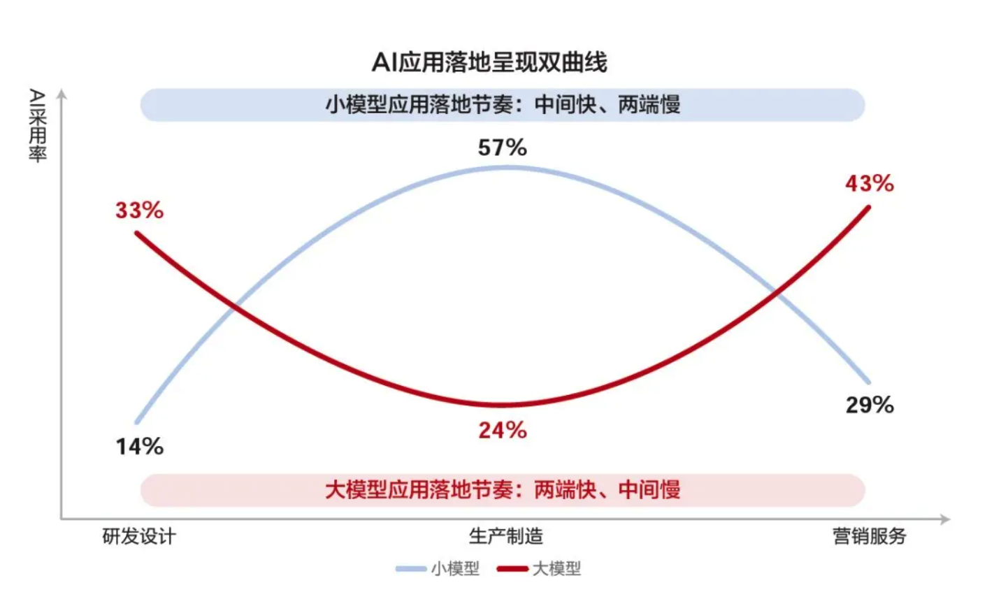 近期,由中国信通院、清华大学人工智能研究院、罗兰贝格及华为联合编撰的《工业与 AI 融合应用指南》引发了行业热议。指南中提到的工业AI应用“双曲线”特征,精准地描绘了当前制造业智能化转型的复杂图景,即通用大模型在研发和营销服务端率先快速渗透,而工业小模型则在生产制造端率先深耕。这种看似分化的融合路径,指向了一个核心命题:在工业领域,AI的竞争不是简单地把大模型搬进工厂,而在于能否构建真正理解工业场景的模型体系。