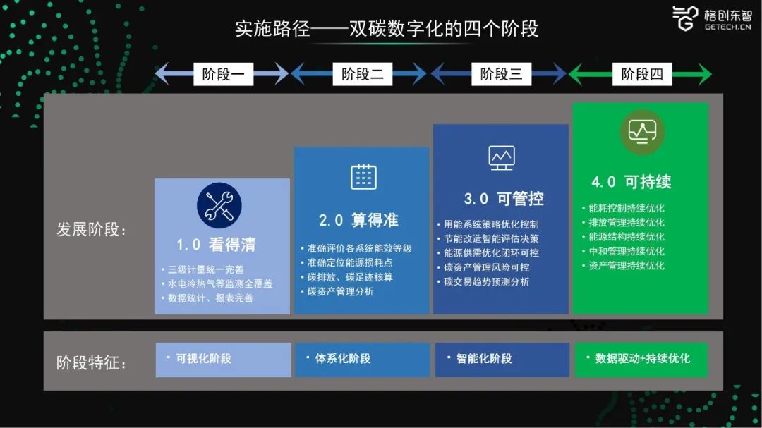 k8凯发东智认为,制造业双碳的实施路径概括可以概括为双碳数字化的四个阶段: