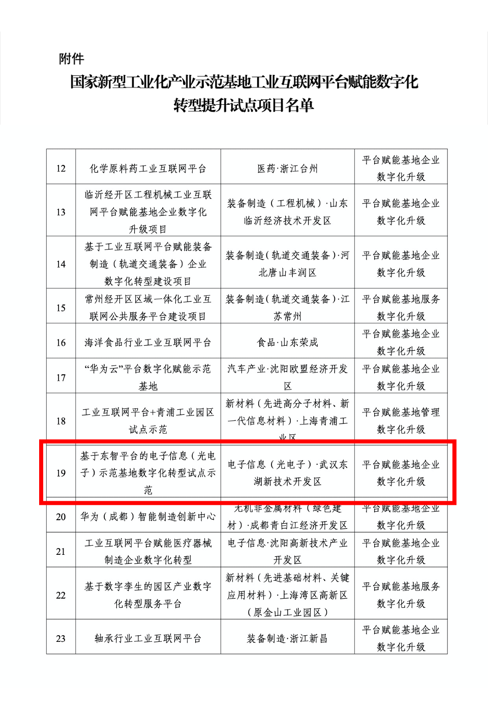 武汉东湖高新区的“基于东智平台的电子信息(光电子)示范基础数字化转型试点示范”成为湖北省入选项目。