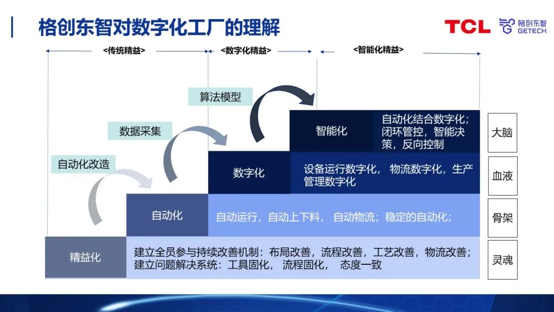 整体数字化工厂体系的关键是精益化、自动化、数字化、智能化,其中,智能化是数字化工厂的“大脑”,数字化是”血液”,自动化是“骨架”,精益化是“灵魂”,它们贯穿工厂产品生产的全流程,帮助制造业实现从传统精益到数字化精益、智能化精益的跃迁。