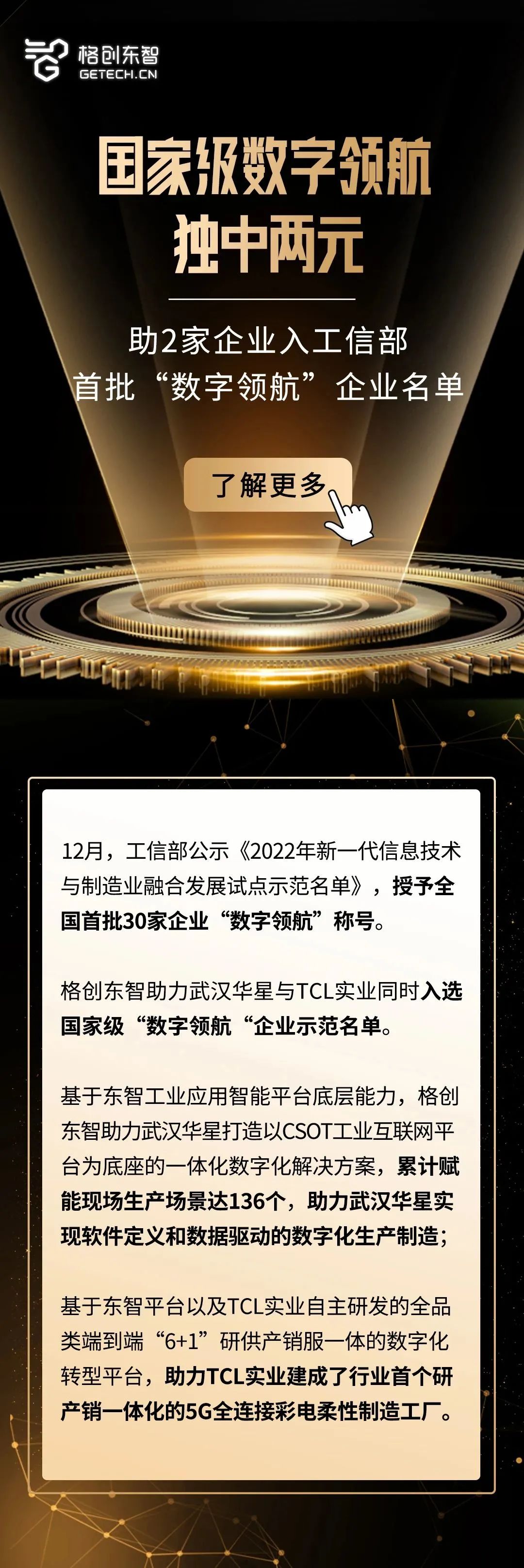用行动践行“领先科技 和合共生” 2022-12-29 2022年从平台进入国家队到入选工信部试点我们在平台技术、企业赋能、行业推动等方面通过多项最严苛的国家级“大考”,我们用实际行动,践行着TCL“领先科技,和合共生”的使命和愿景。心怀更远大的理想2023年我们将奔向更远方!