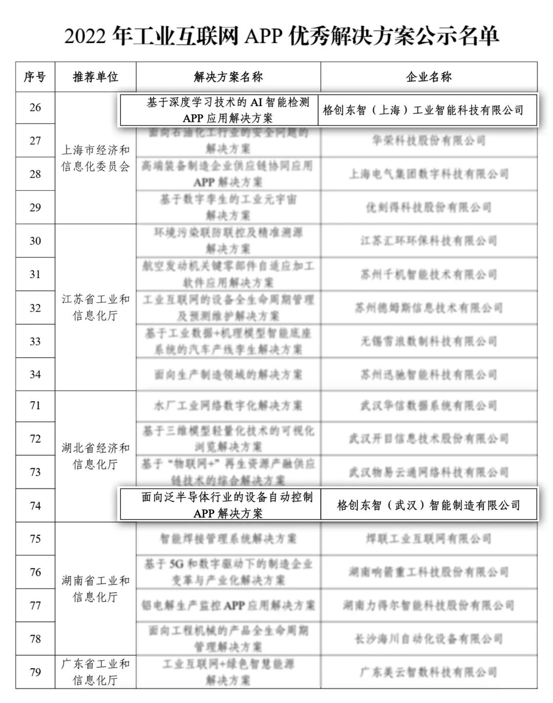 1月13日,工信部发布《2022年工业互联网APP优秀解决方案名单公示》,由k8凯发东智研发的 “基于深度学习技术的 AI智能检测(天枢AI)APP 应用解决方案”、“面向泛半导体行业的设备自动化(EAP)APP 解决方案”入选。