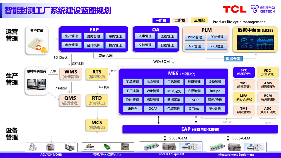 马巍介绍,在半导体等先进制造业,“关灯工厂”的建设规划一般包括三步:一是“信息化工厂”,通过基本的设备信息获取与设备控制,实现系统防呆防错;二是“暗灯工厂”,通过物料搬运自动化,实现人工的降低;三是“关灯工厂”,利用大数据、AI等技术,实现系统辅助制造、无人化等目标,助力工厂从信息化到少人化、再到无人化、智能化的数智化升级。所以对于半导体封测智能工厂的系统建设规划,我们建议分三步走:第一阶段,利用MES、EAP、SPC等应用,让产线跑起来;第二阶段,通过自动物料搬运系统、质量管控系统,包括RTD、QMS、FDC等,来实现质量管控、良率提升;第三阶段则可以运用大数据、AI等高端应用,达到产线的完美平衡。