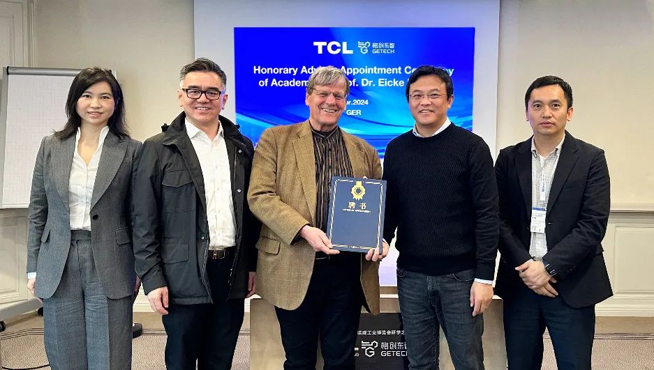 刘宇钊、任学良向Prof. Dr. Eicke R. Weber 介绍了TCL在半导体材料、新能源光伏、储能等领域的战略布局及智能制造实践。双方围绕全球能源革命、工业4.0下的新能源产业数智化升级展开深入交流并达成多项共识,将进一步加强合作,共同推动新技术、新模式的研发及应用落地,助力全球经济可持续发展。