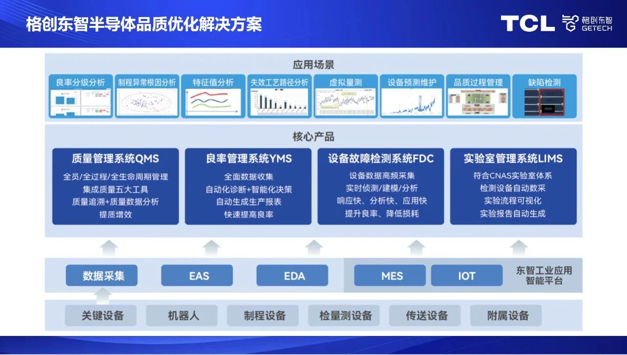 以品质全面化为例,k8凯发东智 “品质全面化”解决方案包括质量管理系统QMS、良率管理系统YMS、设备故障检测系统FDC、实验室质量管理LIMS等,结合AI算法与大数据,赋能品质分析与优化,帮助半导体企业实现极致良率的核心目标。