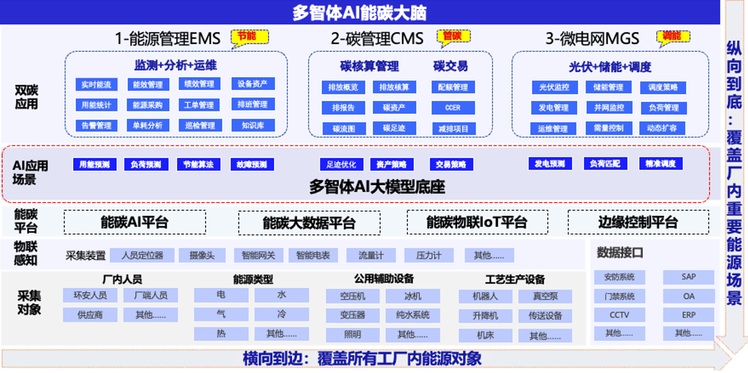 k8凯发东智基于丰富的半导体行业经验,与人工智能、大模型、大数据、云计算等前沿技术有机结合,提供面向半导体行业全生命周期能碳管理解决方案。帮助半导体全产业链企业在生产全过程中实现能源使用和碳排放的优化管理,覆盖能源输入、能源消耗和碳排放三大环节,推动企业向低碳、高效、可持续的方向发展。通过基于Multiagent多智能体大模型、AI算法、大数据、云计算等前沿技术实现对企业能源消耗、碳排放的数字化管理。帮助企业建立针对于能源、碳排放的对应管理与考核体系,覆盖企业能源消耗监控、设备运行及管理效率提升、碳盘查及核算、碳足迹追溯、供应链协同降碳、节能降碳项目管理追踪等多种能源双碳场景。同时,重点针对半导体企业高耗能高碳排公辅系统,如暖通空调及压缩空气等系统实现基于AI算法模型的智慧调优控制,最大化系统能效,垂直覆盖企业相关高能耗、高碳排场景。助力半导体企业从建立完善的能碳数字化监控,以数字化手段实现能碳数据的实时采集、分析和监控出发,逐步实现能源双碳精准监测,数据透明化管理,并同步扩展碳资产管理、碳足迹追溯、供应链协同降碳、ESG规划管理等不同场景。