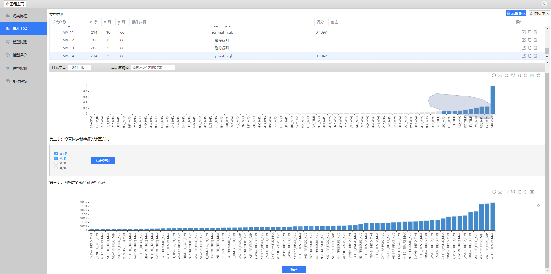 第二步自主挖掘特征,是非常重要的一步,特征的好坏决定了模型的成功与否。您可以自行选择特征挖掘方法,操作非常简单,与此同时,GeekMind还提供自动特征挖掘算法,只需要勾选新特征构建可能的算法,即可生成一些重要的关键特征。新生成的特征将被加入进因子集中,成为用户重点分析的对象。