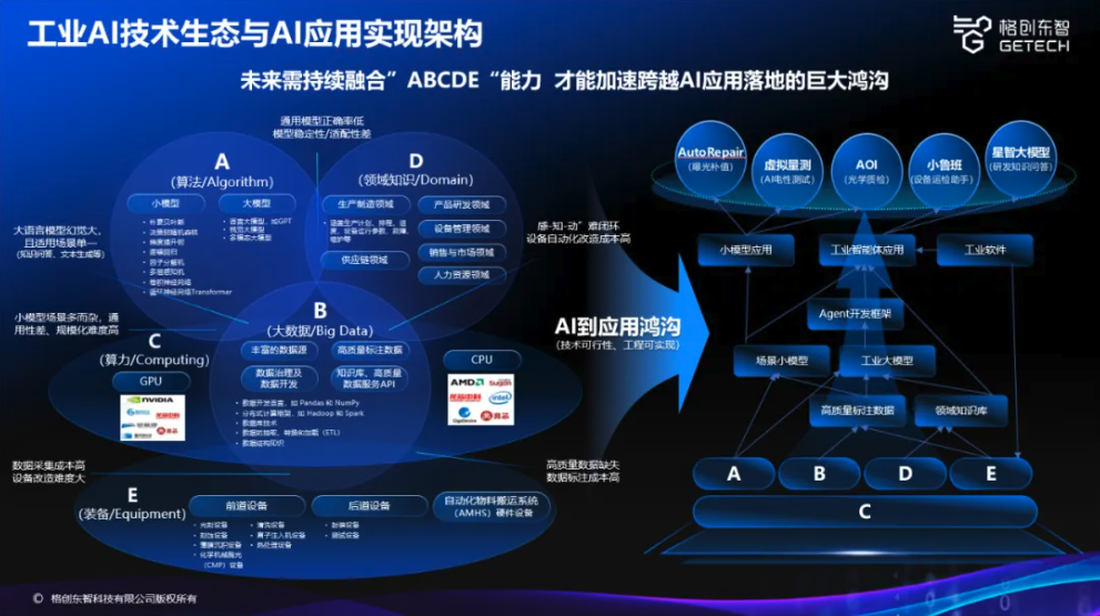 为实现制造业在稳定性、准确性方面的极致追求,杨丽指出,工业AI落地除需满足算力、算法、数据方面的基本要求,还应融合工业细分行业的领域知识和装备经验,实现“ABCDE”即算法Algorithm、大数据Big Data、算力Computing、领域知识Domain、装备Equipment五大领域综合能力的持续协同发展,不断突破技术可行性,打通技术到更多具体工业场景的落地路径。