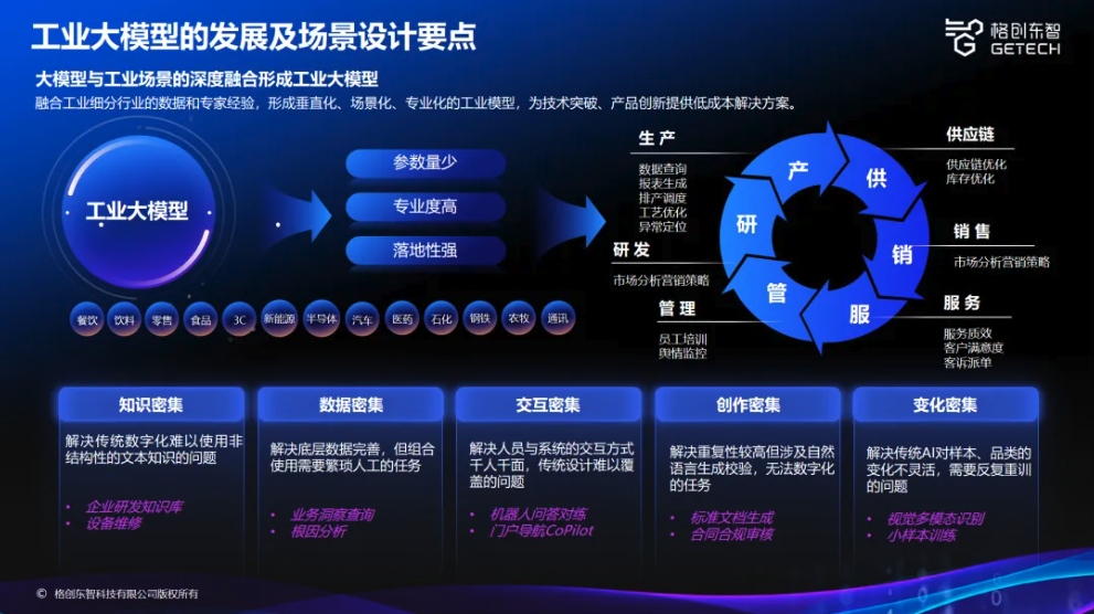 不可否认,推动大模型深度融合具体工业场景,成为AI成功落地的关键之一。杨丽强调,由于存在参数量少、专业度高、落地性强的特点,工业大模型在结合具体场景的设计过程中,需进一步满足知识密集、数据密集、交互密集、创作密集、变化密集等具体工业场景对数字化提出的特殊要求,包括使用非结构性文本知识,满足多样化人员系统交互,完成涉及自然语言生成校验的数字化任务,实现AI灵活应对样本品类变化等。