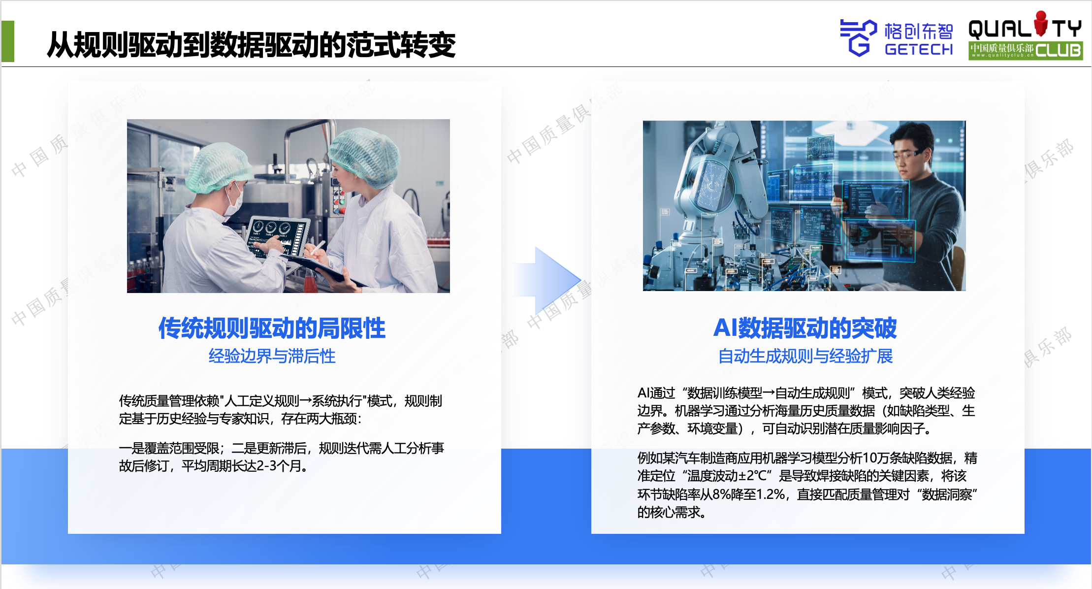 当前,制造业质量管理仍困囿于人工依赖、数据割裂与规则滞后等现状。赵志表示,传统质量管理的从“人工定义规则”到“系统执行”模式,覆盖范围有限且更新滞后。相比之下,AI通过“数据训练模型”到“自动生成规则”方式,可以打破人类经验的边界。AI机器学习通过分析海量历史质量数据(如缺陷类型、生产参数、环境变量),自动识别潜在的质量影响因子。例如,某汽车制造商应用机器学习模型精准定位温度波动±2℃是导致焊接缺陷的关键因素,将该环节的缺陷率从8%降至1.2%,直接匹配质量管理对“数据洞察”的核心需求。由此,赵志建议要从规则驱动向AI数据驱动开展质量管理范式转变。