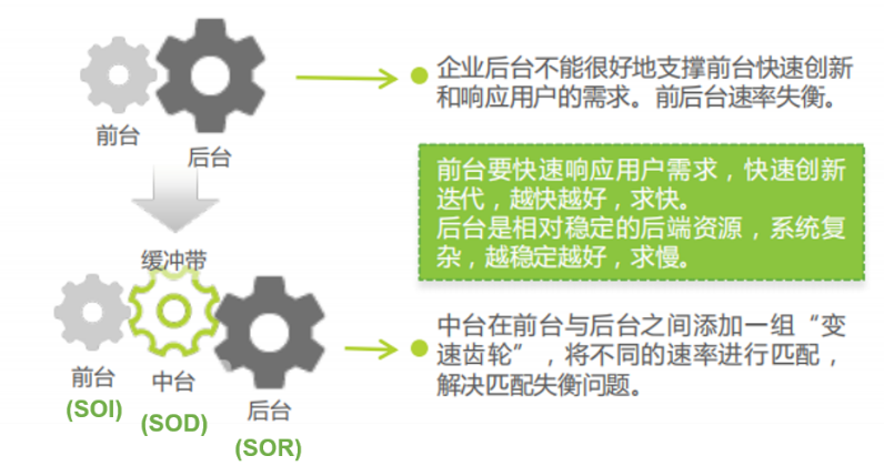 报告中按照“步速”将企业的应用系统划分为SOR、SOD、SOI三个层次,SOR(后台)要求稳定, SOI(前台)要求小而美、快速迭代,天生齿轮匹配失衡,而SOD(中台)正是为解决这一问题而诞生,如同 “变速齿轮”,将前后台的不同速率进行匹配。
